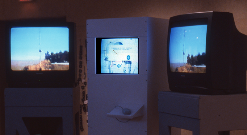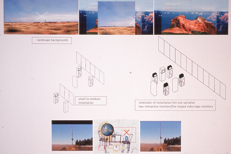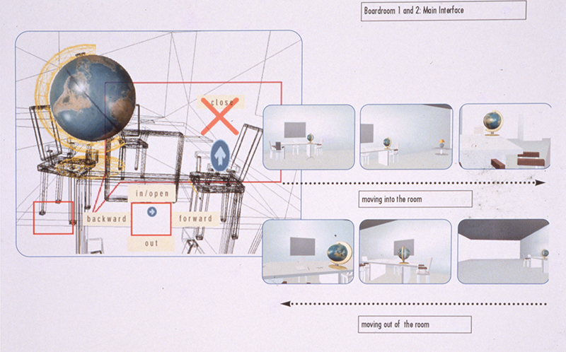 In "The Boardroom" a series of up to 13 separate interactive pieces are linked to the boardroom environment, much like chapters in a book. All thirteen are thematically connected through the idea of how we have created a global culture that is based on images rather than actual physical communities. This installation is comprised of a large background landscape in which two looped videotapes play continuously. These monitors display landscapes in what appear s to be real-time, flanking a third central monitor which is fed by a computer. The computer runs an interactive piece (an interactive CD-ROM) suggesting the metaphor of a meeting or the location of a board-room in which the viewer/user has the option of moving between four chairs in the virtual space of the room. Each position suggests a different view-point on a globe which sits on the conference table. Further exploration moves into a series of text/image/video/and sound anecdotes, which finally terminate back in the original room.