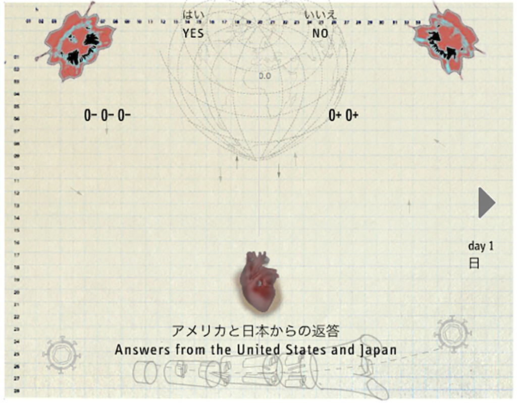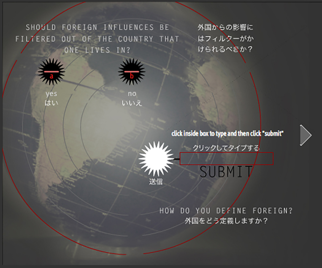The viewer is asked to submit 'yes' or 'no' responses to the question "Should foreign influences be filtered out of one's country," and additionally to respond to "How do you define foreign." These answers are displayed chronologically over the course of the exhibition, and may be scrolled through by viewers. Optionally, pre-printed inkjet prints may also be added to the display with hand-applied + or - stamps that show the collective answers over the course of the exhibition, creating a growing documentation over time
