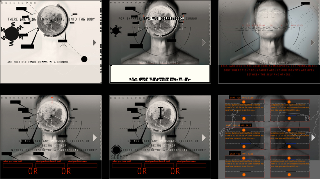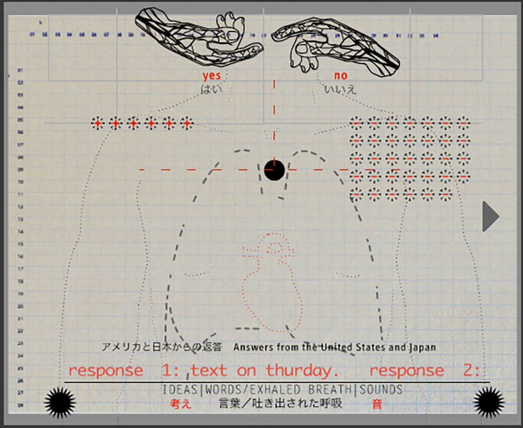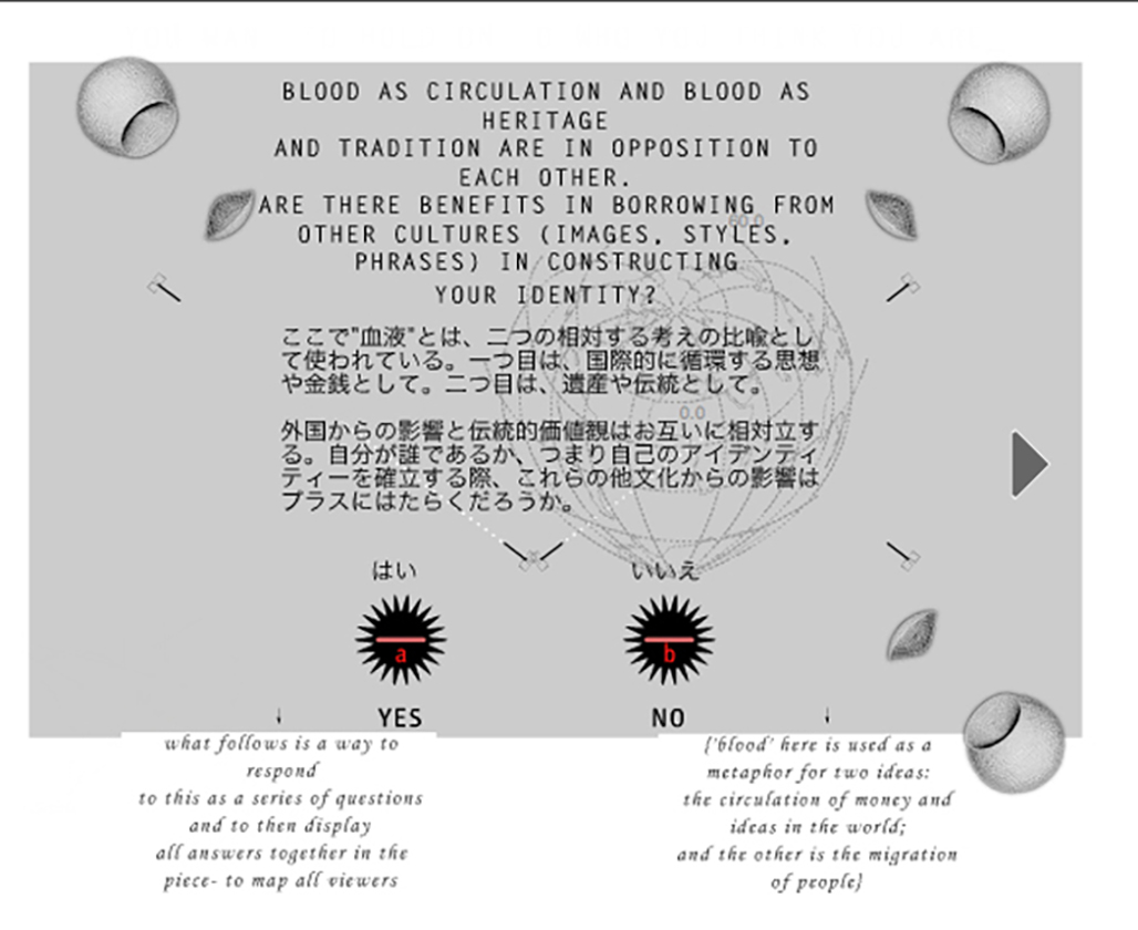 PERHAPS IT'S ABOUT SHARING SPACE WITH SOMEONE DIFFERENT, NOT JUST THEIR LANGUAGE IT'S SOUND, BUT ALSO IT'S TASTE. WORDS ARE BREATH OUT FROM ONE LUNG TO ANOTHER. LANGUAGES, VIRUSES, INFECTIONS, THE SMELL OF STRONG ODORS EMANATING FROM AN APARTMENT DOWN THE HALL. The text is displayed as a looped animation, while other animations underscore the intimacy of breathing in the same air- two bodies/lungs inhale and exhale + and - symbols in the opening screen. The viewer is asked to submit 'yes' or 'no' responses to the question Should foreign influences be filtered out of one's country, and additionally to respond to- How do you define foreign? These answers are displayed chronologically over the course of the exhibition, and may be scrolled through by viewers. Optionally, pre-printed inkjet prints may also be added to the display with hand-applied + or - stamps that show the collective answers over the course of the exhibition, creating a growing documentation over time.
