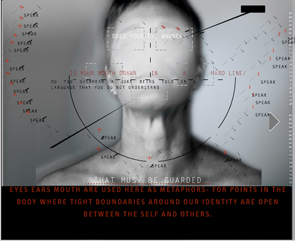 "Breath" This piece uses a text that equates the sound of a foreign language with breathing and 'contamination;' living in the same apartment building, sharing a neighborhood with others that are not of the same culture as the reader of the text.