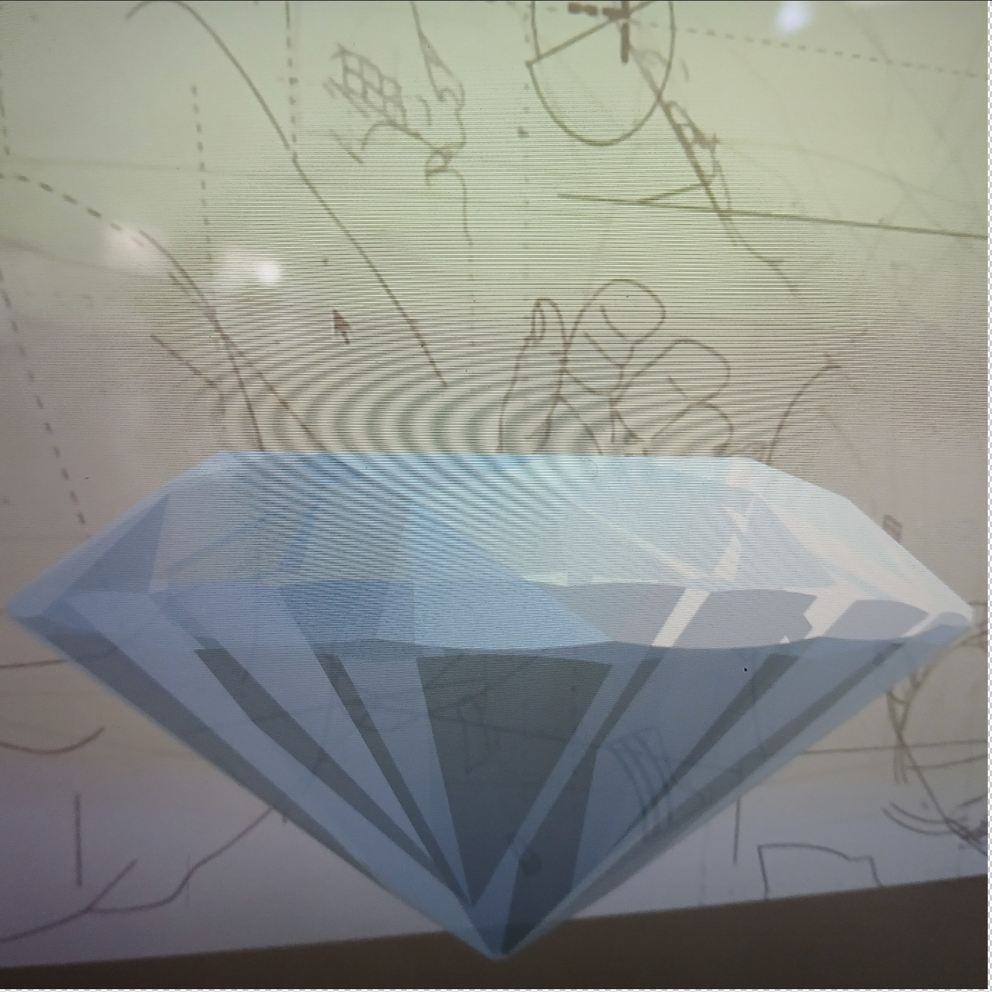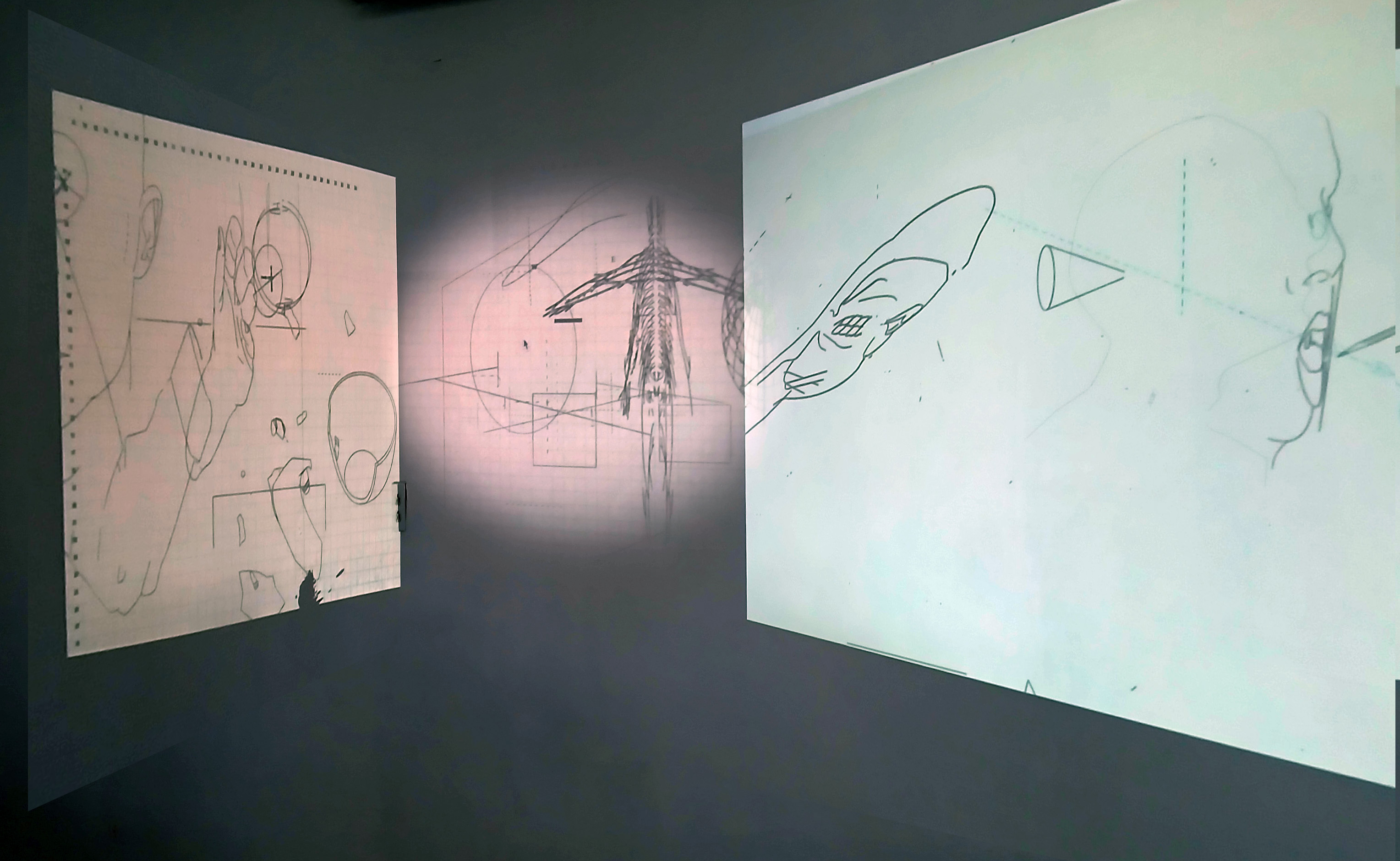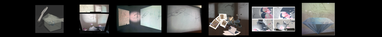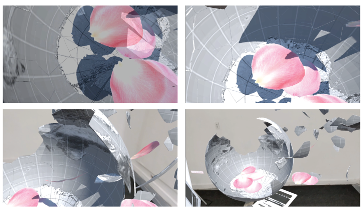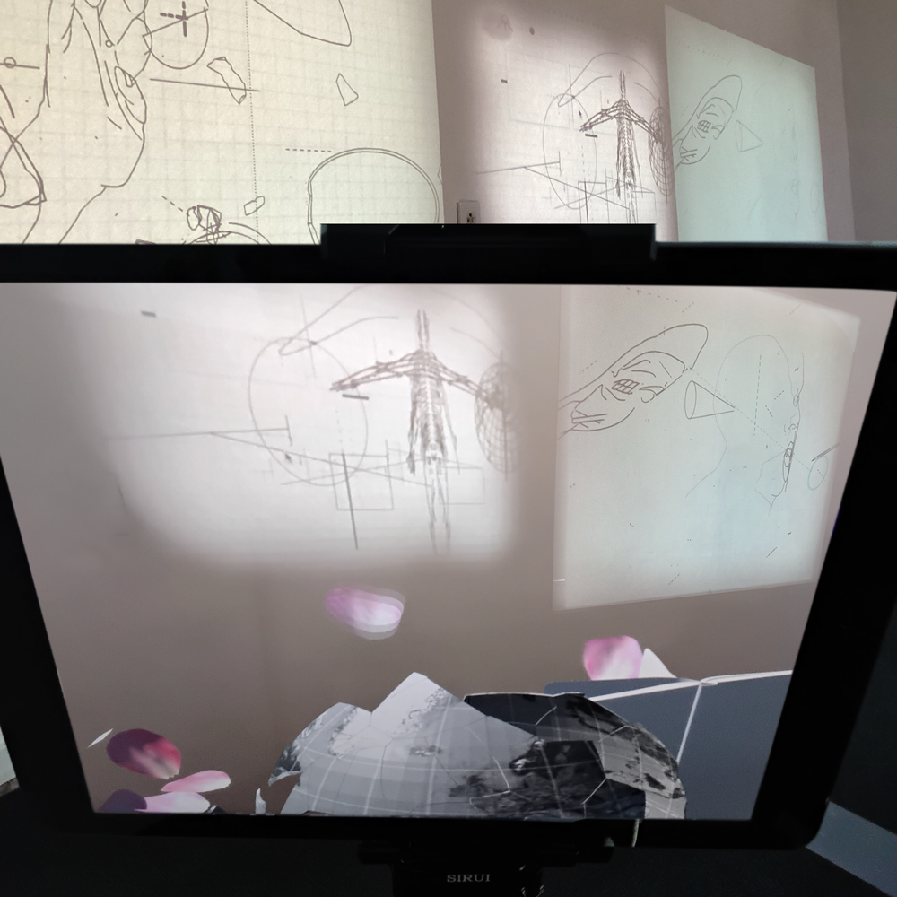 A monitor in the space shows the AR and projections together. Adjacent to this are two to three iPads for viewers to use. A text introducing the ideas and background of the installation also includes a QR code for people to access the AR on their phones. Secondly, the feed shown on the monitors can be shown via the Internet. Looped projected animations flank the AR.
