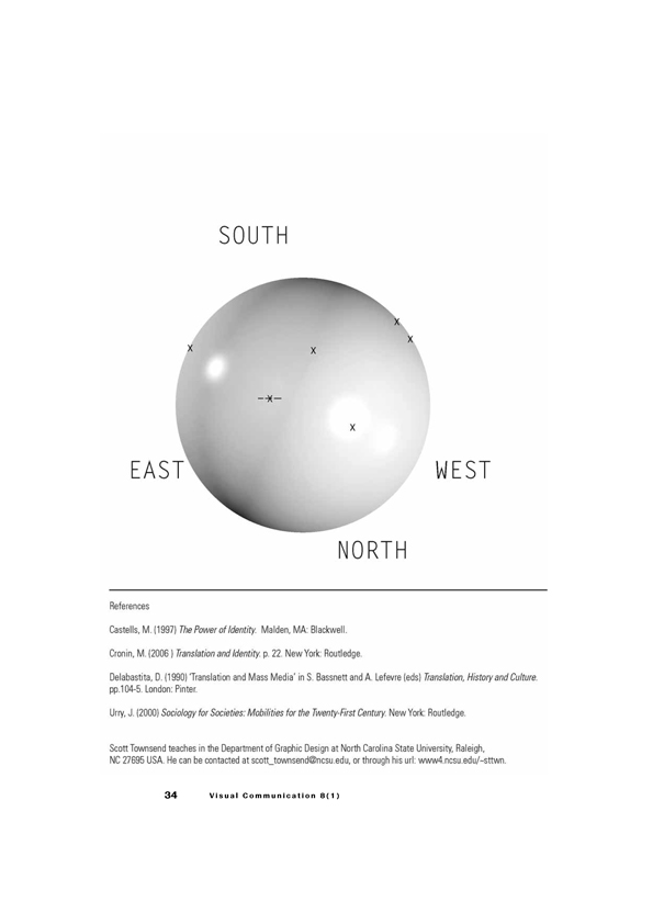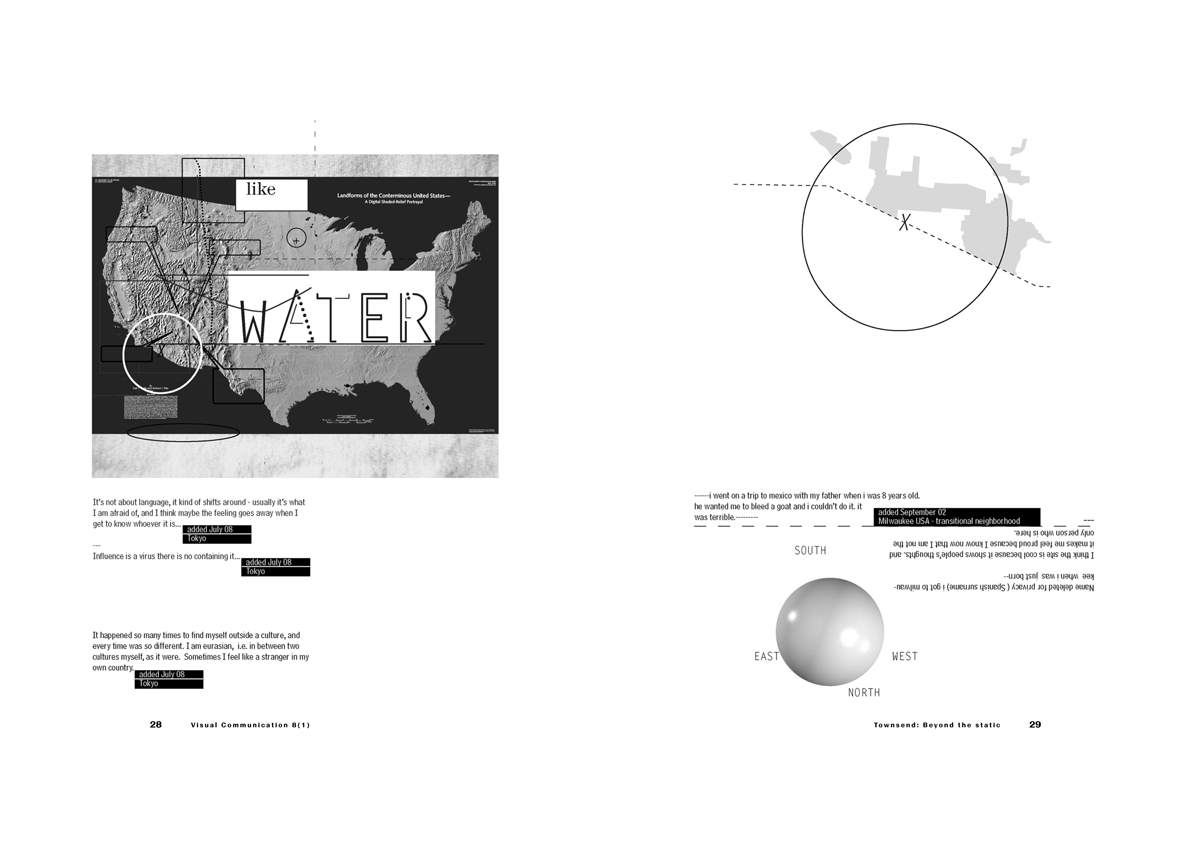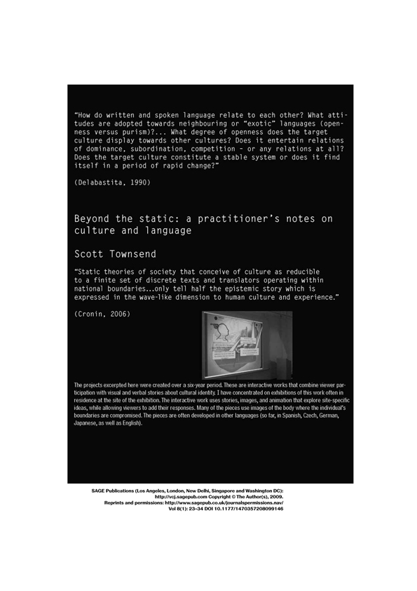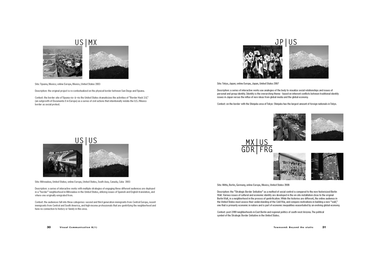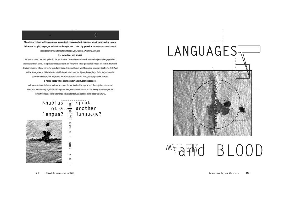[Beyond the Static: Visual Essay for Visual Communication (Taylor and Francis)]: page spreads. Theories of culture and language are increasingly concerned with issues of identity, responding to new influxes of people, languages and cultures brought into contact by globalism. Discussions center on issues of cosmopolitan versus nationalist identities (see, e.g., Castells, 1997; Urry, 2000), and how individuals and groups find ways to interact and live together. This essay chronicles several projects from the last six years in a hybrid visual format. This essay was published in Visual Communication, February 2009 (Sage: London and New York).